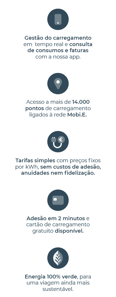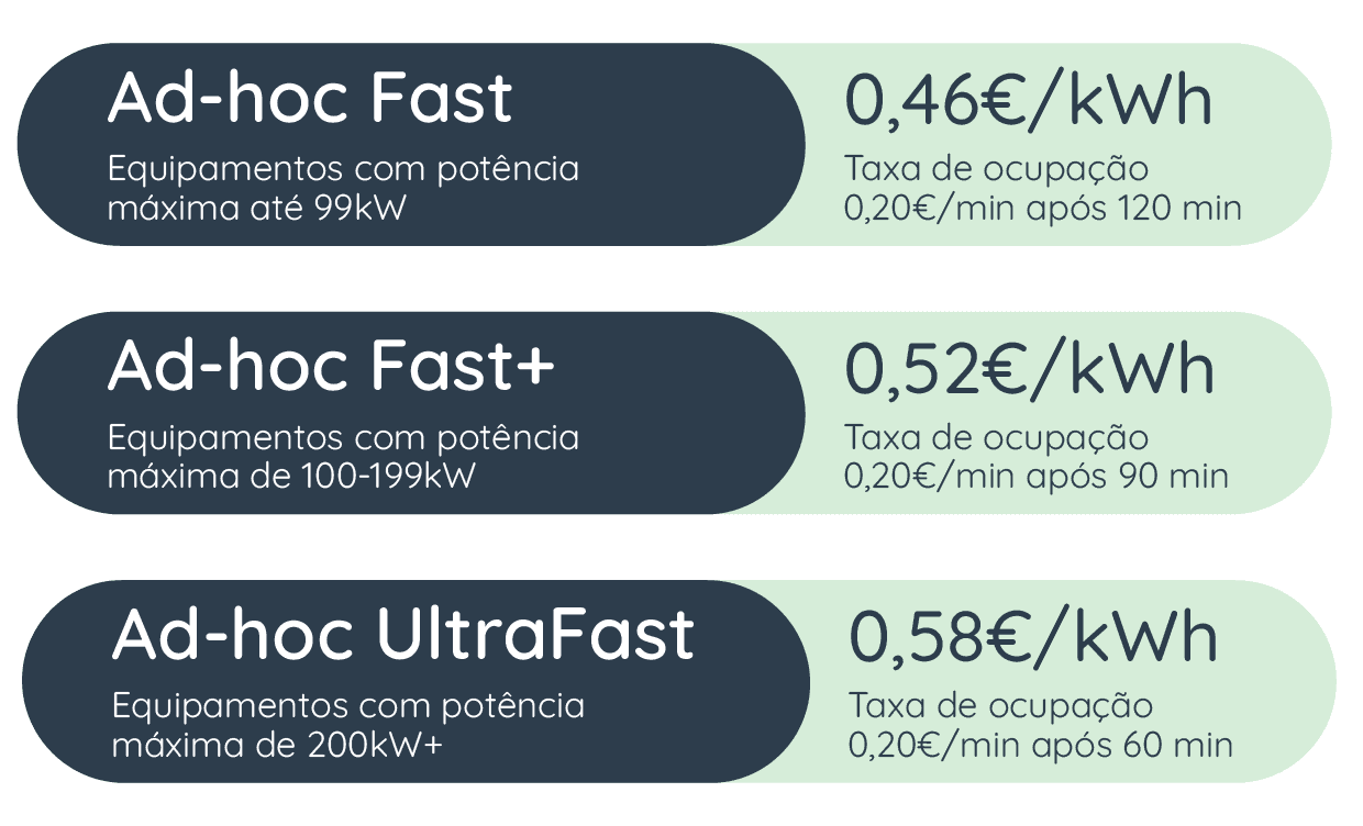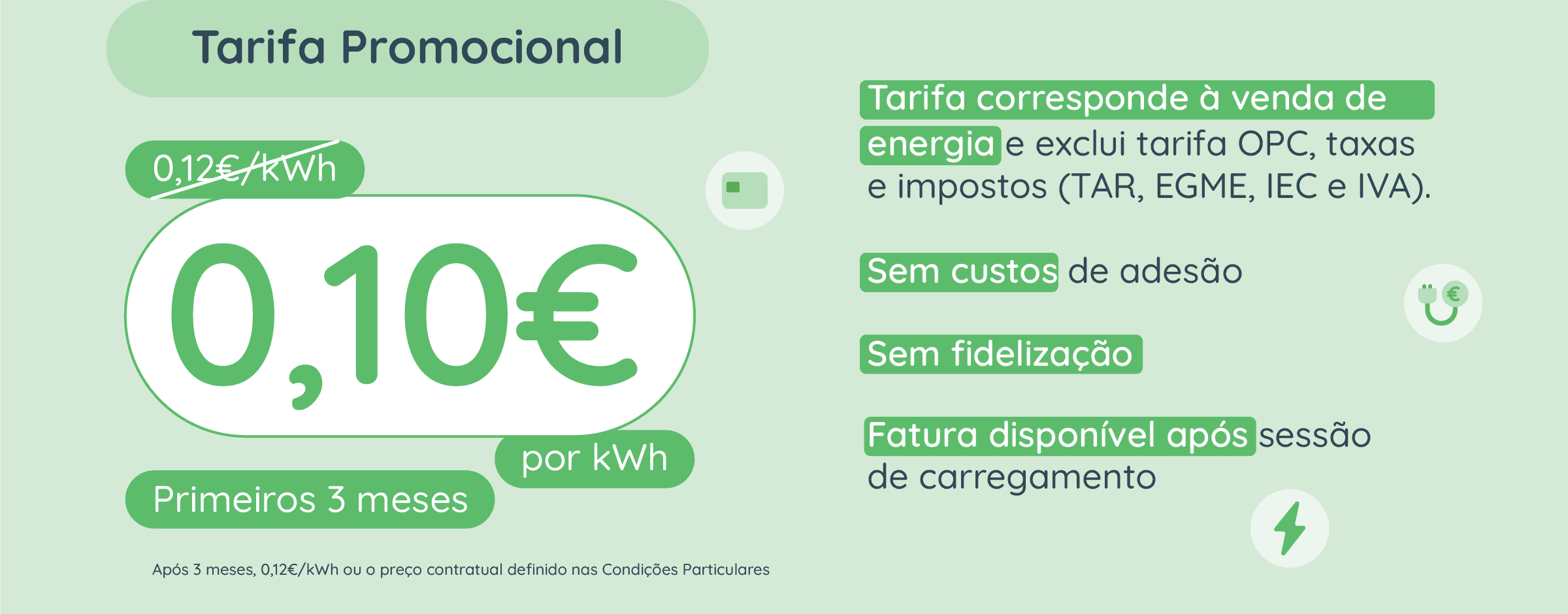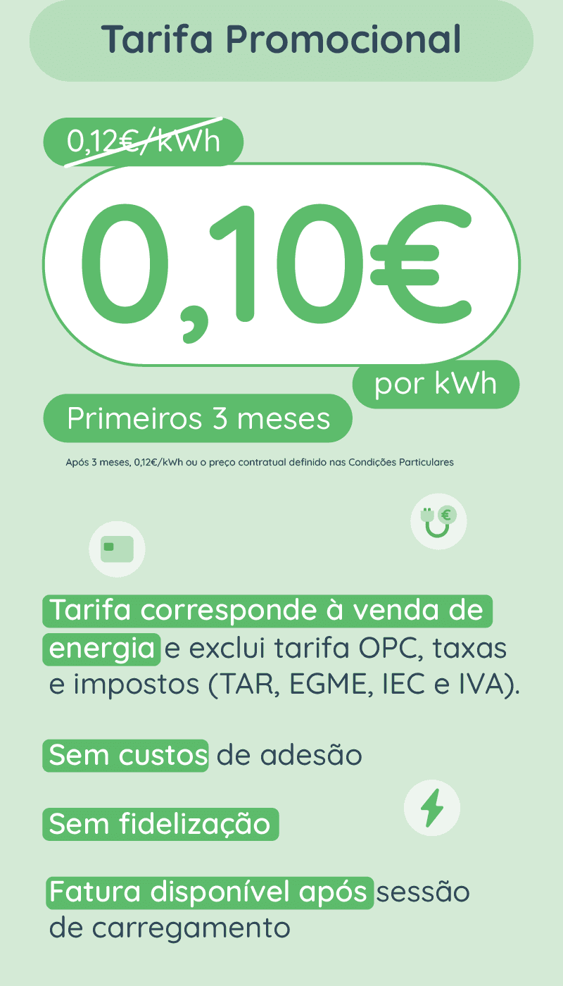 Preço inclui tarifa OPC, tarifa de energia, TAR, tarifa EGME, IEC e IVA. Sem custos de adesão nem fidelização. Fatura disponível após sessão de carregamento.