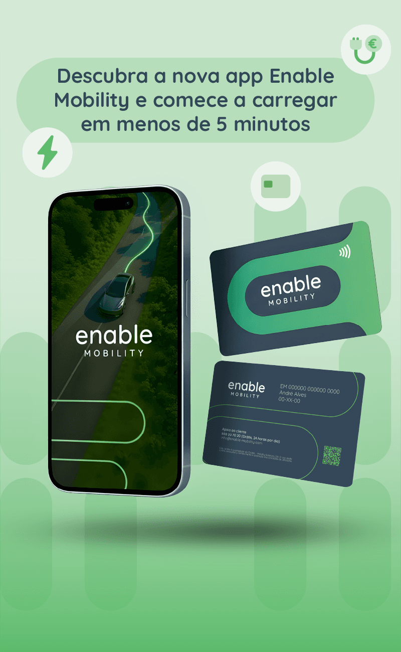 Preço de energia para carregamento em todos os postos ligados à rede Mobi.E com cartão ou app Enable Mobility.